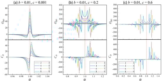 Figure 4 plots the selected  and  relationships for N = 2 to 9 at b = 0.01 and c = 0.001, 0.2, and 0.6, respectively. In the scenario where , corresponding to small damping and weak coupling, both  and  have the same spectral shape as shown in Figure 4a. The  spectra are symmetric about , with  for all N, and only two fixed zero-crossings locations are observed, with  0.995 and 1.005, both symmetrically located about . In addition, the  spectra are notably sharper than those in Figure 2a and the corresponding maximum values ( are in the order of 10–80, significantly larger than those in situations with larger damping. For  spectra, only 1 pair of  and  are observed at  0.997 and  1.003, regardless of N, also symmetrically located about . Furthermore, we observe that . The small separation between  and  results in a small spectral span in  but much greater magnitudes compared to Figure 2b. The magnitude of both  and  increases monotonically with N.