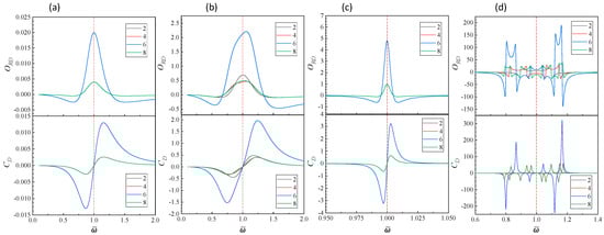 As c increases to 0.6, signifying a strong coupling case, the  and  relationships become even more complicated as shown in Figure 4c. All the  and  spectra become markedly asymmetric, with espectral features stretched in  region. For N = 2, 3, 4, 5, 6, 7, and 8, both the  and  spectra closely resemble those at c = 0.2, yet with increased asymmetry and expanded separations of relative peaks or dips. However, for N = 9, two zero-crossing locations emerge for  at  and for , negative dips appear at 0.79 and 0.17, accompanied by two positive peaks at 1.17 and 1.4.