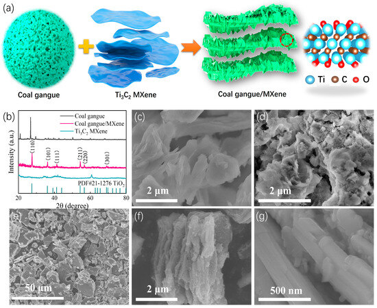 (a) Schematic description of the fabrication of coal gangue/MXene; (b) XRD pattern of all catalysts; SEM image of raw coal gangue (c), activated coal gangue (d), Ti3C2 MXene (e), and coal gangue/MXene (f,g).