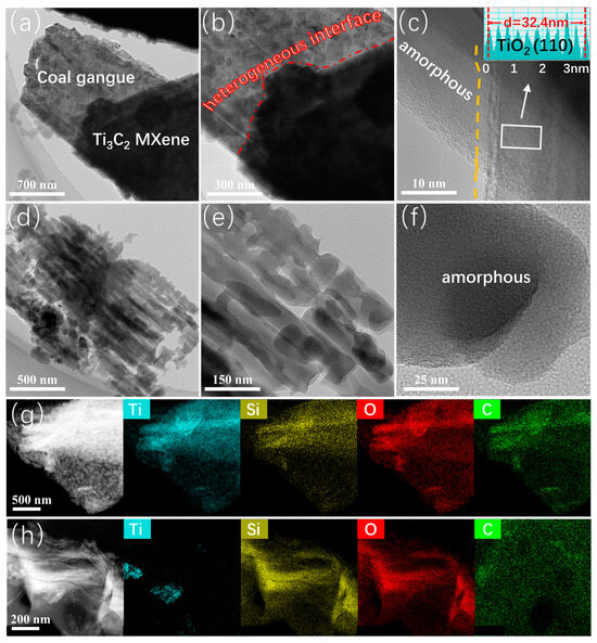 TEM image (a,b) HR-TEM image (c) of coal gangue/Ti3C2 MXene; TEM image (d,e) HR-TEM image (f) of coal gangue/Ti3C2 MXene; EDS mapping images of coal gangue/Ti3C2 MXene (g,h).