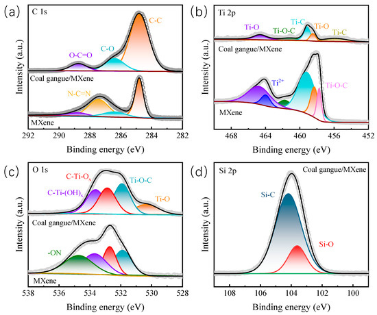 High-resolution C 1s (a), Ti 2p (b), O 1s (c), Si 2p (d) spectra for coal gangue/Ti3C2 MXene and Ti3C2 MXene.