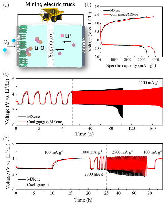 (a) Reaction mechanism of coal gangue/MXene-based LOBs. (b) Initial full discharge/charge curves of as-prepared catalyst-based LOBs at 2500 mA g−1; (c) cycling stability of as-prepared catalyst-based LOBs at 2500 mA g−1; (d) rate performances of as-prepared catalyst-based LOBs.