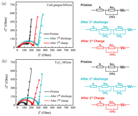Figure 5 shows the electrochemical impedance spectra (EIS) of the coal gangue/Ti3C2 MXene hybrid and Ti3C2 MXene at different statuses. The ohmic resistance (R0) for the coal gangue/Ti3C2 MXene-based cathode (11.70 Ω for pristine state) is slightly larger than that of the Ti3C2 MXene-based cathode (5.79 Ω for pristine state). In addition, the charge transfer resistances (Rct) of the coal gangue/Ti3C2 MXene hybrid and Ti3C2 MXene after the first discharge were found to be 225.57 and 220.80 Ω, respectively. The larger Rct in the coal gangue/Ti3C2 MXene hybrid could be ascribed to the lower electric conductivity of the coal gangue. As shown in the EIS corresponding analog circuit diagram, CPE2 and Rct2 appeared after the first discharging point in both the coal gangue/Ti3C2 MXene hybrid and the Ti3C2 MXene; this indicates that a new interface was produced by the deposition of the discharge products. Furthermore, the Rct of the coal gangue/Ti3C2 MXene hybrid can recover to a lower numerical value after the following charging process, indicating the excellent catalytic properties of the coal gangue/Ti3C2 MXene hybrid in promoting the decomposition dynamics of Li2O2. In detail, the in situ-formed TiO2/SiCX catalytic units could optimize the structural stability and expose a large number of catalytically active sites at ultra-high rates, thereby exhibiting excellent low-impedance characteristics.