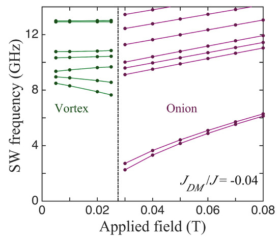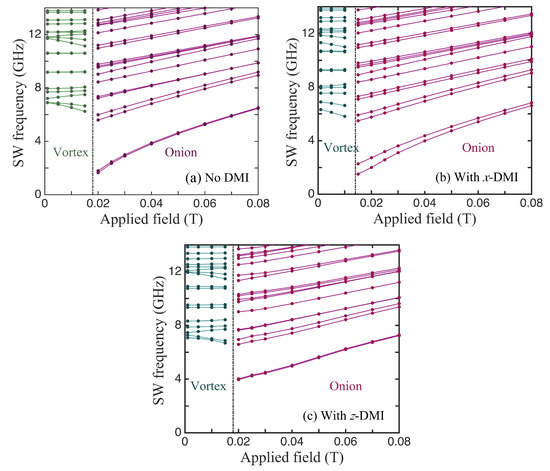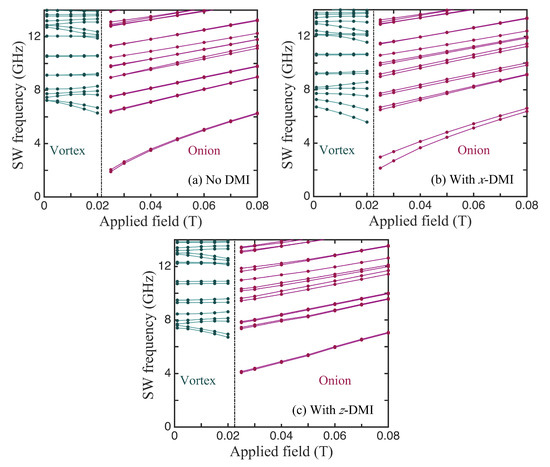 In Figure 5, we compare three cases for the SWs in ferromagnetic nanorings with an outer radius of 100 nm, an inner radius of 36 nm, and a thickness of 4 nm, for which the static behaviour was discussed earlier in Figure 3. The lowest SW frequencies plotted versus the applied field in the absence of DMIs are shown first in Figure 5a. The vertical line at T indicates the transition field between the stable vortex and onion states. In the vortex case, we note that several of the discrete SW modes sloped downwards with the increasing field. This is typical of magnetic systems in which there are spins aligned both parallel and antiparallel to the field (e.g., antiferromagnets below the spin-flop transition) and is in accordance with previous theory [31] and Brillouin light scattering experiments [37] for nanorings. In the onion case, the SW frequencies all increased with the field. This is mainly due to the Zeeman term in the Hamiltonian, but it is noticeable that the lowest line in Figure 5a, which is actually two degenerate SW modes, has a convex curvature upwards because the magnetization is still reaching saturation. The modifications due to DMIs can be seen in Figure 5b,c, which correspond respectively to the in-plane axial vector being along x and z. All of the SW frequencies were shifted in general and there were seen to be splittings in some cases, where a degeneracy was removed. A clear example occurred in the x-DMI case where the doubly degenerate lowest frequency level in the onion state was split, with the effect being more pronounced just above the transition field (which now occurred when T). By contrast, in the z-DMI case (where the DMI axial vector lies along the field direction), this degenerate lowest level underwent no significant splitting; in fact, its curvature reversed due to the DMI. Also, the transition field was effectively unchanged by the DMI. We have no obvious explanation for these differences, but they seem to be a consequence of the fact that, in the x-DMI case, the DMI energy in Equation (4) involves an spin component. This couples more strongly to the applied magnetic field via the Zeeman interaction.