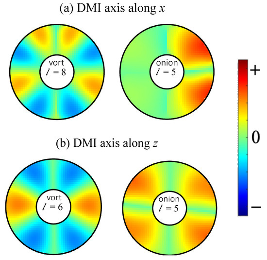 Colour plots of SW amplitudes for a nanoring with outer radius 100 nm, inner radius 36 nm, and thickness 4 nm (as in Figure 3 and Figure 5) for the DMI axial vector (a) along x and (b) along z. Examples for a vortex state (with T) and an onion state (with T) are shown. The mode numbers l are as labelled. The corresponding frequencies of the modes are 10.61 and 7.79 GHz from left to right in (a) and 9.30 and 7.97 GHz from left to right in (b).