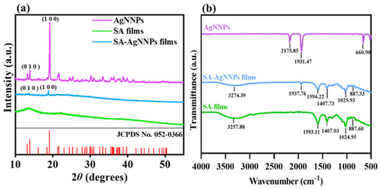 X−ray diffraction analysis (XRD) (a) and Fourier transform infrared spectroscopy (FTIR) spectra (b) of AgNNPs, SA films, and SA-AgNNPs films.