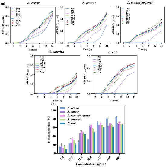 Growth curves of different bacterial pathogens with different concentrations of SA-AgNNPs films (a) and the biofilm inhibition ratio of SA-AgNNPs films against different pathogens (b).