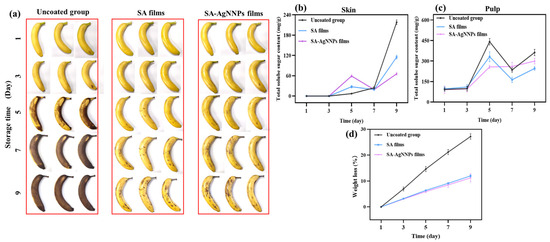 Appearance changes (a), total soluble sugar content in the skin (b), total soluble sugar content in pulp (c), and weight loss (d) of uncoated bananas, SA-coated bananas, and SA-AgNNPs-coated bananas when stored at 25 °C.