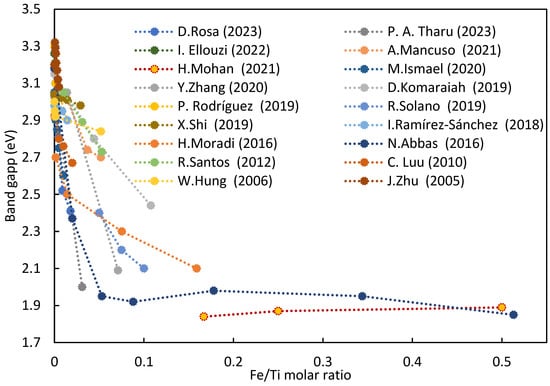 Band gap of titanium oxide doped with iron at varying Fe/Ti ratio [6,31,38,48,51,56,61,68,69,70,71,72,73,74,75,76,77,78].