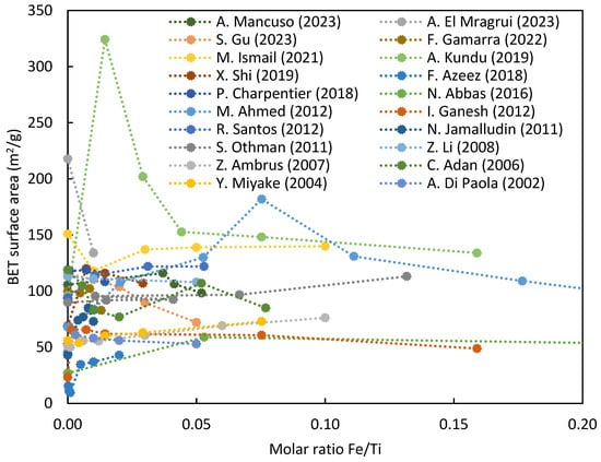 BET surface area of iron-doped TiO2 nanoparticles at varying Fe/Ti ratio [22,31,51,52,53,54,56,57,58,59,62,71,74,84,86,87,88,89,90,91,92].