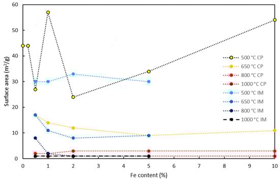 The significant role of iron and, notably, the decisive influence of the calcination temperature is evident in Figure 8. Notably, the specific duration of calcination, typically ranging from 1 to 4 h, has not been considered, except in the study by J. Navio (1998), where the sample was subjected to a 24-h treatment at 500 °C [37].