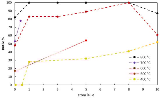 For excessive amounts of iron, the rutile phase decreases as non-negligible pseudobrookite formation occurs [103] due to iron oxide segregation.