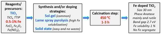 Among potential heteroatoms, iron is highly favored for doping titania [24,25], as shown in Figure 2, due to its cost-effectiveness [26] and efficacy. Additionally, its atomic radius, similar to titanium (0.61 Å for Ti4+ hexacoordinated and 0.55 Å for Fe3+ hexacoordinated) [27], facilitates the simple substitution of iron into the crystalline lattice of titanium [28,29]. While other authors may report slightly different values, they remain closely comparable, such as 0.645 Å for Fe3+ and 0.604 Å for Ti4+ [30,31] or 0.64 Å for Fe3+ and 0.68 Å for Ti4+ [32,33].