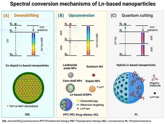 (A) Downshifting mechanism associated with Co-doped Ln-based NPs; (B) Upconversion mechanism associated with Ln2O3 NPs, QDs, Core–shell Ln-based NPs, Ln-doped NPs and multimodal Ln-based platforms, and (C) Quantum cutting mechanism associated with hybrid Ln-based nanoparticles.