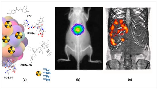 Prostate-specific membrane antigen (PSMA protein) is an important molecular target due to its overexpression in various cancer cells, including advanced and metastatic prostate cancer. This has led to successfully generating radiolabeled PSMA inhibitor peptide (iPSMA) based systems as agents for molecular imaging and radiotherapy [23,105,106]. Another protein overexpressed in several neoplastic cells, including early prostate cancer, is the gastrin-releasing peptide receptor (GRPr), which recognizes the bombesin peptide selectively and specifically [107]. Therefore, a heterodimeric peptide of iPSMA and bombesin has been reported in the functionalization of [153Sm]Sm2O3 nanoparticles with radioluminescent and radiotherapeutic features (NIR at 750 nm), allowing in vivo optical imaging of their biodistribution and high affinity with respect to PSMA protein and GRP receptors [22].
