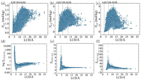 Following the high-throughput calculations, univariate analyses were conducted to investigate the correlation between the material structure and the separation performance of the complex ternary gas mixtures of C1, C2, and C3 in the MOFs. Figure 2a–c illustrate the relationship between the adsorption of C1, C2, and C3 components and LCD. When LCD is less than 2.5 Å, the adsorption of alkanes by MOFs is limited by the space between alkane molecules and pore walls, resulting in almost no adsorption. When the length of the shortest distance between the alkane molecules and the skeleton molecules of MOFs is between 2.5 Å and 6 Å, the intermolecular relative force increases with the length of the shortest distance, and the amount of adsorption also increases. A peak appears, known as the first peak, corresponding to the LCD, which is slightly larger than the kinetic diameter of the C1/C2/C3 molecule (C1~3.8 Å, C2~3.9 Å, and C3~4.3 Å). As the LCD increases, the interaction between the backbone molecules and the alkane molecules weakens, causing NC1NC3 to decrease. Surprisingly, the adsorption increases again when the LCD is between 6.5 Å and 12.5 Å, forming a relatively strong peak known as the second peak. The second peak corresponds to approximately three times the kinetic diameter of the C1/C2/C3 molecule. The intensities of the first and second peaks gradually increase with the growth of the carbon chain. In the univariate analysis, we analyzed the relationships between the selectivity of individual components C1, C2, and C3 and LCD. Log transformations were applied to reduce the effects of extreme values due to the wide distribution of the variable SC1/C2+C3. Figure 2d–e show the relationships between the selectivity of C1, C2, and C3 components and LCD. The selectivity distribution plots of C1, C2, and C3 exhibit significant peaks at different values of LCD, corresponding to the kinetic diameter of the C1/C2/C3 molecule. This peak gradually shifts backward with the growth of the carbon chain. The selectivity peak appears at smaller LCD values because the molecular radii of C1, C2, and C3 gradually increase, and C1 molecules with shorter carbon chains can enter smaller pores more easily. As the carbon chain length increases, the molecules of C2 and C3 require larger pores to be adsorbed efficiently, causing the selectivity peaks to shift gradually back to larger LCD values. The discovery of the second peak in the constitutive analysis is similar to the work of Yuan et al. [32] and effectively broadens the scope of the structural design of high-performance materials.