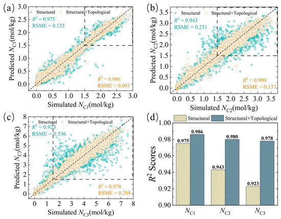 Figure 3a–c and Figure S1 (Supplementary Materials) display the distributions of calculated and predicted data for the XGBoost algorithm using different feature sets to predict the N, S, and TSN for C1, C2, and C3. The figure shows that, after adding the topological descriptor, the yellow points are more concentrated on the diagonal than the green points, improving the overall prediction effect, especially for the medium–high performance region (N greater than 1.5 mol/kg), where the prediction accuracy is significantly improved. The medium–high performance region refers to MOF materials with better adsorption and separation properties. This study aims to improve the prediction of performance parameters, as accurate prediction is critical for component separation applications in natural gas. Another key improvement is that we observe an improved convergence between the simulated and predicted data; as shown in Table 1, the R2 value of the model has increased and the RMSE value has decreased, indicating a better fit of the model to the data. This improvement results in predicted values that are closer to the actual observed values, and the model performs better. The topological descriptor of the material can provide multi-scale structural information to comprehensively describe its characteristics. This has a significant impact on the MOF-C1C2C3 system, improving the fit of the XGBoost model to actual MOF performance data, and making it more consistent with theoretical simulations. Ensuring the reliability of performance predictions on unknown materials is crucial for the credibility and practicality of our model.