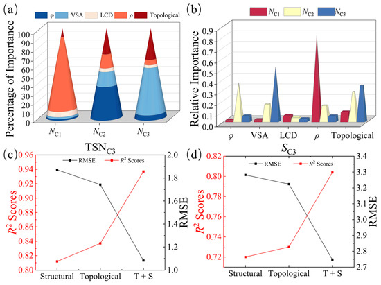 Figure 4. The XGBoost algorithm model predicts MOFs for different system adsorption, with (a) percentage of importance values and (b) feature importance values. Comparison of RMSE and R2 scores of the XGBoost algorithm model for predicting (c) TSNC3 and (d) SC3 for different feature sets.