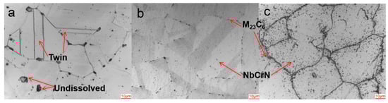 The metallographic organization of HR3C steel pipe; (a–c) are, respectively, the supply pipe, aged pipe and service pipe.