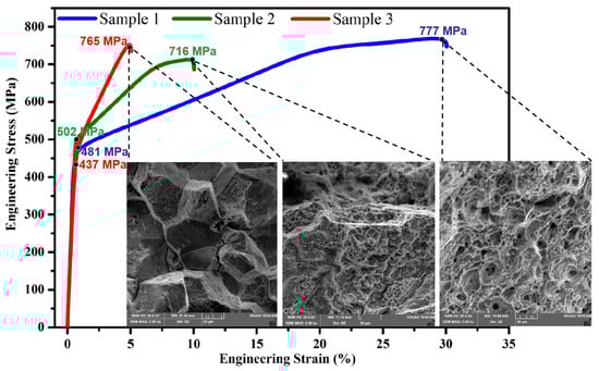 Mechanical properties and fracture morphology. Three typical tensile strain curves at room temperature and corresponding fracture patterns. Sample 1 is the steel pipe in the supply condition, sample 2 is the steel pipe after aging, and sample 3 is the steel pipe after serving 70,000 h.