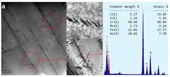 During the TEM experiment, the regular square precipitates were found in the austenite crystal of the steel pipe with a size of about 50~100 nm, which was identified as the CrFe type σ phase by microenergy spectrum analysis under transmission electron microscopy, and the Cr content was as high as 50% (Figure 7). The σ phase is an intermetallic compound precipitated in the matrix during long-term service, and the temperature range of σ phase precipitation from the γ austenite matrix is generally 600~980 °C, which is consistent with the operating temperature of the experimental service steel pipe. The literature [32,33,40] indicates that the pre-precipitation of M23C6 at grain boundaries promotes in situ nucleation of the σ phase on M23C6, and it has been reported that a part of M23C6 will be transformed into the σ phase after long-term aging at 650~850 °C, so the σ phase is precipitated late in the matrix.