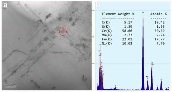 The grain boundary of the aged steel pipe became obvious because of the presence of carbides. TEM images showed that the precipitated carbide particles had a broken chain shape and were distributed along the grain boundary, with some of the long strips of carbide parallel to each other. EDS analysis results showed the presence of Cr16Fe5Ni2C6 (M23C6) carbides, the longest of which was more than 100 nm long (Figure 6). It was found that M23C6 carbides appear rapidly in the early stage of aging, and usually preferentially precipitate and start to precipitate at the position of carbon atoms and vacancy on the grain boundary or twin boundary, as well as in the area with high dislocation density and distortion energy [27,34]. The size and quantity of M23C6 carbides increase rapidly with the rapid diffusion of carbon atoms through dislocation and vacancy at grain boundaries over time. When subjected to external forces, the interface between the coarse M23C6 and the matrix can preferentially become the location of micro-crack nucleation, and the carbide M23C6 is easily stripped from the matrix, but still close to the grain boundary, so the grain boundary widens significantly with the extension of high-temperature aging time. However, the coarse M23C6 carbides precipitated along grain boundaries in chain form will seriously weaken the creep strength of the material. Therefore, HR3C steel pipe shows an obvious embrittlement phenomenon in the early stage of service at high temperature, and the impact fractures of embrittlement samples are all intergranular cracking. So, the continuous flaky precipitation of M23C6 carbide at the grain boundary causes the early embrittlement of HR3C steel. Yang et al. [35] observed through transmission electron microscopy that when the creep time was extended from 1608 h to 17,115 h at 650 °C, the size of M23C6 carbides increased by about 57%, but increased by about 3% after 27,943 h, and continued to prolong the creep time. The mean diameter of M23C6 carbides barely changed.
