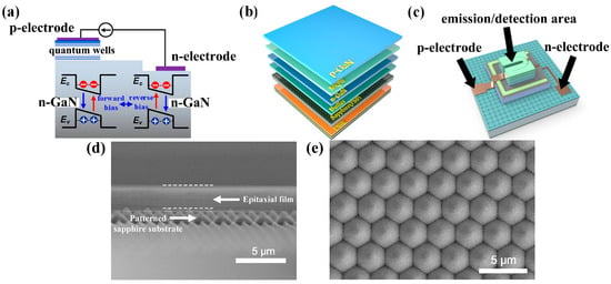 (a) Schematic of luminescence detection coexistence of III-nitride multi-quantum wells diode device; (b) layered structure of III-nitride epitaxial material with multi-quantum wells on sapphire substrate; (c) schematic of single micro-LED device; (d) cross-sectional SEM image of the epitaxial film on the patterned sapphire substrate; (e) top-view SEM image of the patterned sapphire substrate.