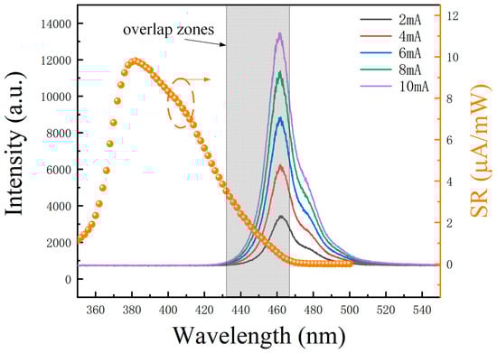 Figure 6 shows the electroluminescence and responsivity spectra of the micro-LED at varying currents. The 4 × 4 series-biased micro-LED was driven by the Keithley 2636B digital source meter, ranging from 2 mA to 10 mA. The emitted light was collected with an optical fiber and directed to the spectrometer. The electroluminescence spectra are depicted by five Gaussian curves in different colors, illustrating the micro-LED’s performance in lighting mode. The peak wavelength fell within the blue range at 461.71 nm, with a full width at half maximum (FWHM) of 17.64 nm. The light intensity exhibited a linear modulation response to the applied currents, rendering the micro-LED an excellent candidate as a transmitter terminal in visible light communication systems. On the right axis of Figure 6, the orange dotted curve represents the responsivity spectra of the 4 × 4 series-biased micro-LED when operating in detection mode. These measurements were obtained using the IQE-200B quantum efficiency measurement system. The peak wavelength for the responsivity spectra was 381.98 nm, boasting a maximum responsivity of 9.80 μA/mW. The responsivity spectra showed a cutoff wavelength of 468 nm. The shaded area in Figure 6 represents an overlap region of approximately 25 nm, where the electroluminescence spectra align with the responsivity spectra. This overlap indicates the electroluminescence spectra in lighting mode and the responsivity spectra in detection mode. Within this spectral overlap, the micro-LEDs can function as transceivers.