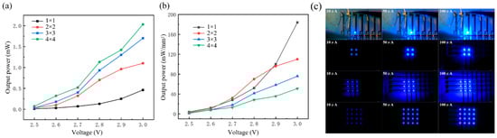 (a) Light output power and (b) light output power density of micro-LED arrays with a different number of series connections; (c) optical microscopy images of micro-LED arrays with a different number of series connections working in lighting mode.