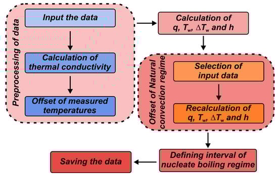 Altogether, five temperatures were measured during the experiment—three inside the sample and two in the water. From these, the heat flux, surface superheat, and heat transfer coefficient were calculated and recorded in real time with the DewesoftX3 2022.1 software, while the post-processing was conducted with Mathworks MATLAB R2021a. The flowchart of data post-processing conducted with MATLAB is presented in Figure 3. More details are available in our previous work [,].