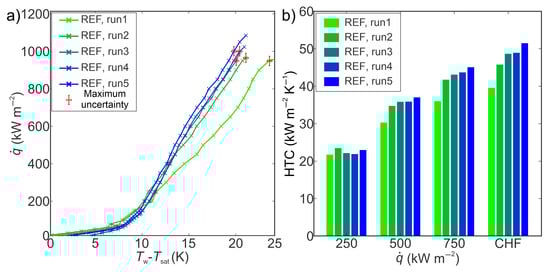 (a) Boiling curves and (b) heat transfer coefficients on the reference surface.
