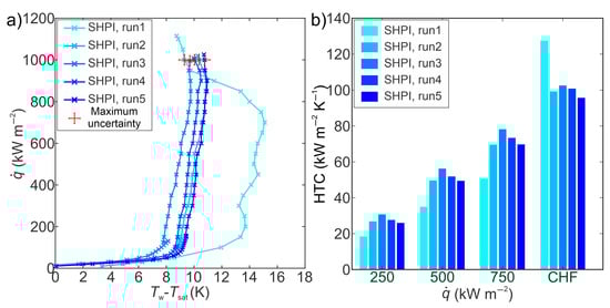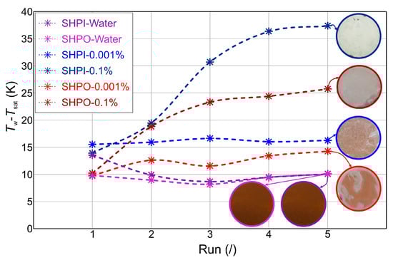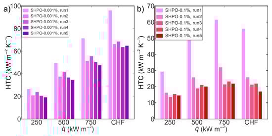 Boiling curves recorded on a superhydrophilic laser-engineered surface using TiO2 water nanofluid at two distinct concentrations are shown in Figure 7. Boiling curves obtained with lower concentrations were stable, and an increase in CHF of 35% from the first to the fifth experimental run was observed. On the other hand, boiling curves obtained with higher concentrations were unstable, and they shifted toward higher superheats with a low increase of CHF from the first to the second experimental run, followed by a decrease from the second to the fifth experimental run. The shift towards higher superheats obtained for the 0.1 wt.% nanofluid can be attributed to decreasing nucleation site density due to the deposition of nanoparticles in microcavities with each consecutive run. At high nanoparticle concentrations, the deposited layer on the surface becomes thicker, which leads to greater thermal resistance and decreases the HTC. However, the highest CHF of 1462 kW m−2 was recorded at higher concentrations, representing an improvement of 35% compared to the highest CHF obtained on the reference sample. The CHF values obtained at 0.1 wt.% were higher compared to the CHF values achieved at 0.001 wt.%, which can be attributed to better wetting properties (i.e., the static contact angle recorded on the surface after boiling with 0.1 wt.% nanofluid was around 3°, while on the surface after boiling, 0.001% wt.% nanofluid was 110°). The observed effect of concentration on CHF is in agreement with the findings presented in the literature [,].