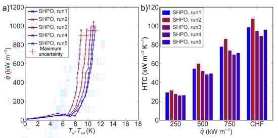 Figure 6 shows the boiling performance (Figure 6a—boiling curves and Figure 6b—HTCs at different heat flux levels) obtained on a superhydrophobic laser-engineered surface. Laser-induced cavities on the surface act as favored locations for nucleation during the boiling process, especially after the hydrophobization process. The static contact angle of 164° ± 0.7° was recorded on superhydrophobic surfaces before boiling tests, while after exposure to boiling, a value of 140° ± 0.8° was measured. The highest HTC of 108 kW m−2 K−1 at CHF was obtained during the third experimental run, with an enhancement of 112% over the reference surface. The average HTC of 97 kW m−2 K−1, obtained on superhydrophobic surfaces during five boiling tests, was similar to the average HTC (99 kW m−2 K−1) recorded on a superhydrophilic (SHPI) surface. The shift of boiling curves towards lower superheat was also observed on the superhydrophobic (SHPO) surface, with a 0.2 K reduction of surface superheat at a heat flux of 500 kW m−2 from the first to the fifth experimental run. On the other hand, at the same heat flux values, a 3.9 K reduction of superheat was recorded on a superhydrophilic surface, indicating that the SHPO sample is significantly more stable than the SHPI surface. The CHF values during the five boiling tests were similar to the CHF values obtained on the reference surface.