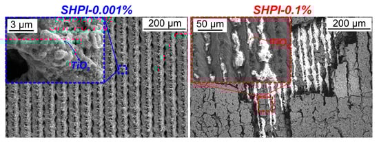 Corroborating this, the conducted SEM analysis (Figure 9) demonstrates that a very thin deposited layer of TiO2 nanoparticles persists on the laser-engineered structure after five hours of boiling at 0.001 wt.% and is only evident at higher magnifications. Conversely, during boiling at higher concentrations (0.1 wt.%), the deposited nanoparticles on the surface manifest more evidently, filling a substantial portion of the laser-engineered surface channels and forming a thicker nanoparticle layer. Thickening of the deposit on the surface results in additional thermal resistance, which can also result in the deterioration of the heat transfer coefficient. Similar observations of the effect of concentration on the deposited layer and further on boiling performance can be found in the literature [,,].