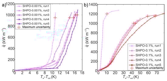 Boiling curves of TiO2–water nanofluid on a superhydrophilic laser-textured surface at (a) 0.001 wt.% and (b) 0.1 wt.% concentrations of TiO2 nanoparticles.