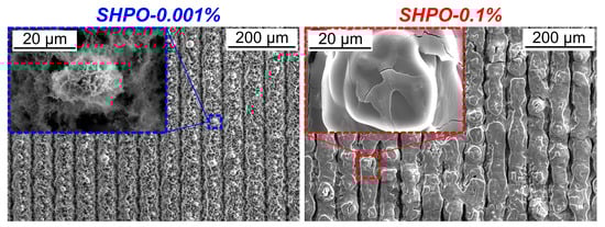 SEM images of superhydrophilic samples after boiling at concentrations of 0.001 wt.% (left) and 0.1 wt.% (right).