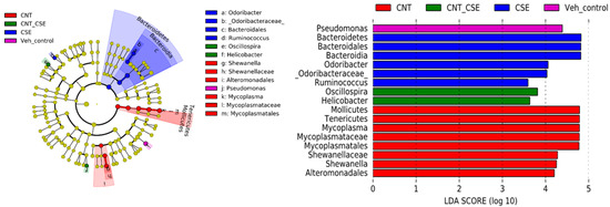Dominant operational taxonomical units (OTUs) of the lung microbiome in mice exposed to respiratory toxicants. The toxicants, animal exposure conditions, and lung microbiota DNA analyses are described in the Materials and Methods (Section 2). The LEfSe analysis shows a higher proportion of Mollicutes, Mycoplasma, Tenericutes, Shewanella, and Altermonadales in the CNT group; Bacteroidetes, Odoribacter, and Ruminococcus in the CSE group; and Oscillospira and Helicobacter in the CNT+CSE group.