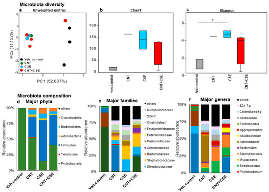 Lung microbiota diversity and compositional changes in mice in response to respiratory toxicants. The toxicants, animal exposure conditions, and lung microbiota DNA analyses are described in the Materials and Methods (Section 2). The top part of the figure depicts microbiota diversity showing differential microbiota clustering for beta diversity based on principal component analysis (a) and alpha diversity based on Chao1 index (b) and Shannon index (c), between the control and treated groups. The bottom part of the figure depicts microbiota composition at the phylum (d), family (e), and genus (f) level showing distinct differences in the CNT, CSE, and CNT+CSE groups compared to the control group. The differences in diversity and composition suggest definitive effects of the toxicant exposures.
