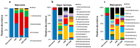 Compositional changes in mouse nasal microbiota at various phylogenetic levels in response to different respiratory toxicants. The toxicants, animal exposure conditions, and nasal microbiota analyses are described in the Materials and Methods (Section 2). Nasal microbiome compositional differences among the treatment groups are shown at phylum (a), family (b), and genus (c) levels. The analysis revealed reduced Proteobacteria and increased Firmicutes in the CNT, CSE, and CNT+CSE groups compared to the control group.