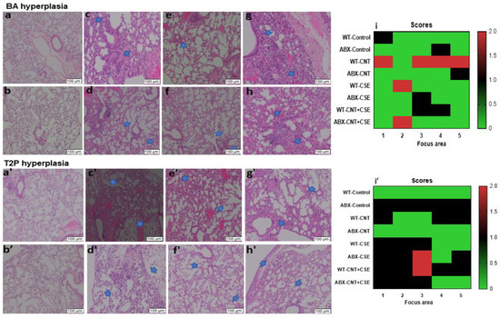 Hyperplasia in the exposed lungs of microbiota-intact (normal) versus microbiota-depleted (ABX) mice subjected to different respiratory toxicants. The hyperplasia changes are shown by arrows in the H&E-stained images. The toxicants and animal exposure conditions are described in the Materials and Methods (Section 2). Bronchoalveolar (BA) hyperplasia is presented in the top part of the figure as follows: upper panels—(a) WT-Control; (c) WT-CNT; (e) WT-CSE; (g) WT-CNT+CSE; lower panels—(b) ABX-Control; (d) ABX+CNT; (f) ABX+CSE; (h) ABX+CNT+CSE. (i) Heat map showing the effects of different exposures. Type 2 pneumocyte (T2P) hyperplasia, also known as alveolar Type2 epithelial cell hyperplasia, is presented in the bottom part of the figure as follows: upper panels—(a’) WT-Control; (c’) WT-CNT; (e’) WT-CSE; (g’) WT-CNT+CSE; lower panels—(b’) ABX-Control; (d’) ABX+CNT; (f’) ABX+CSE; (h’) ABX+CNT+CSE. (i’) Heat map showing the effects of different exposures. The x-axis numbers 1–5 in panel (i) and (i’) represent the five different focus areas analyzed per slide. The y-axis numbers 0, 0.5, 1.0,1.5, and 2.0 in panel (i) and (i’) represent the injury scores on a 0 to 4 scale, with 0 being normal and 4 being severe. Microbiota depletion resulted in a lower grade of hyperplasia (BA and T2P) in either CNT- or CSE-exposed mice.