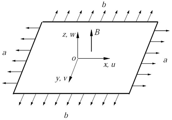 Consider steady, three-dimensional mixed convection flows of nanofluids past stretching sheets in the presence of an applied magnetic field. A schematic diagram of a physical model and a coordinate system is shown in Figure 1. Here, consider three different types of nanoparticles: Cu and Al2O3 are shown in Table 1. Assuming that hybrid nanofluids are incompressible and the flows are laminar, the velocities of the stretching sheets are in x and in y, and a uniform external magnetic field is applied in z. The surface temperature has a constant value of and the ambient temperature is , where > . Using the hybrid nanofluid model proposed by Wainia et al. [48] and referring to Xu and Zhao et al. [49,50], the governing equations are given as follows: