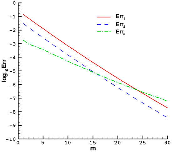 The HAM residual errors of , of the hybrid nanofluid Cu-Al2O3-H2O; , , , determined parameters , . Err1—solid line; Err2—dashed line; Err3—dashed dotted line.