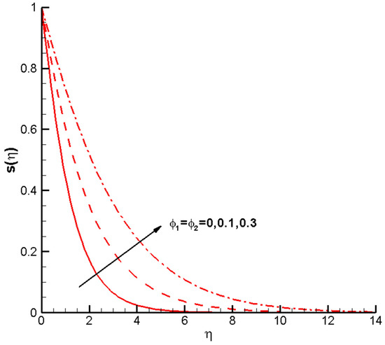 As shown in Figure 2, when , of the hybrid nanofluid Cu-Al2O3-H2O, with , , and the determined parameters , , the series solution obtained is uniformly effective in the various orders of HAM computation. Residual errors for the mth-order HAM computation and CPU times (Lenovo P720) are shown in Table 3. For the first-order HAM, the residual errors are = 0.15849, = 0.15849, and = 0.00251. As the mth order of the HAM-approximated analytical solution increases, the residual errors gradually decrease. When m < 15, the relationship of the three residual errors is > > . For the fifteenth-order HAM, the residual errors are between 3.98107 × 10−5 and 7.94328 × 10−6, with CPU times of 127.641 s. Then, begins to exceed . When m > 25, the relationship of the three residual errors is > > . Compared with the hybrid nanofluid flow equations, the convergence speed of the coupled temperature equation is slower. For the 30th-order HAM, the residual errors are between 1.62181 × 10−8 and 3.98107 × 10−9, with CPU times of 4006.94 s (more than 30 times the 15th-order calculation). , describe the physical quantity of the volume fraction of the solid Cu and Al2O3 nanoparticles in the hybrid nanofluid Cu-Al2O3-H2O. represents the Newtonian fluid of water, and , ≥ 0 represents hybrid nanofluids. An analysis of the influence of the nanoparticle volume fraction , on the velocity profiles of , and temperature distributions is shown in Figure 3. The solid lines represent velocity profiles , the dashed lines show the velocity profiles , and the dashed dots show the temperature profiles . When , increases from 0 to 0.1, the velocity profiles , decrease. As the concentration of nanoparticles increases, a decrease in velocity can be observed. As shown in Figure 4, when , increases from 0 to 0.1, the temperature profile increases. Changes in velocity follow a similar trend; the increase in monotonically decreases along with . The larger the volume fraction of the nanoparticles , , the higher the temperature distribution . This can be attributed to the hybrid nanofluids, which possess better thermal conductivity than the base fluid (water). Consequently, the fluid’s heat transfer capacity is significantly enhanced, resulting in an improved distribution of temperature. The findings suggest that, with an increase in the proportion of nanoparticles in the hybrid nanofluid Cu-Al2O3-H2O, there is a decrease in the velocity distribution, an increase in the temperature distribution, and the boundary layer’s thickness becomes noticeably more prominent. The calculation results indicate that, as the volume percentage increases, the velocity profile shows a downward trend, and the temperature curve shows an upward trend. A larger volume fraction is responsible for the increased viscosity of the nanofluids.