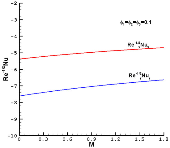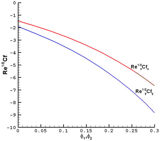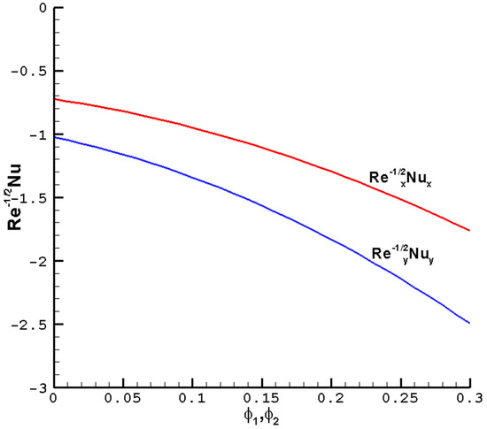 Figure 5 considers the effects of the nanoparticle volume fraction on the , of the local skin friction coefficient and the local Nusselt number. As the , of the hybrid nanofluid Cu-Al2O3-H2O shifts from 0 to 0.3, the reduced local skin friction coefficients and both decrease monotonically. As the volume fractions of the nanoparticles , increase, the local skin friction coefficients decrease, while the heat transfer increases. Notably, the nanoparticles exhibit a greater amount of kinetic energy when their concentrations are higher, resulting in an enhancement of their heat transfer ability through increased kinetic energy. Similarly to the variation trend of the local skin friction coefficients, the local Nusselt numbers and vary with , . Figure 6 shows that the local Nusselt numbers experience a gradual decrease and evolve at a slower pace than the local skin friction coefficients. This can be attributed to the volume fraction of the nanoparticles , of the hybrid nanofluid Cu-Al2O3-H2O. The convective and conductive heat transfer ratios across the boundary can be increased by enhancing the heat transfer. Given the superior thermal conductivity and heat transfer abilities of nanofluids over pure fluids, this phenomenon once again proves that nanofluids are superior to pure fluids.