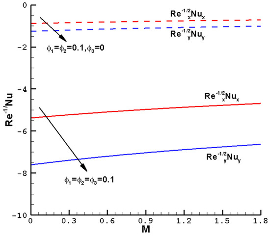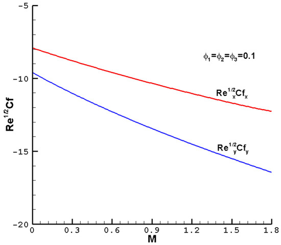 Figure 7, Figure 8, Figure 9 and Figure 10 show the effects of the different parameters , , , on physical measurements, such as the skin damage and heat transfer rates at specific locations. The most important industrial parameters are the local reduced friction coefficients , and the Nusselt numbers and . When a fluid flows on a surface, the distribution of the frictional force applied to the surface is called the skin friction profile of the fluid. The ratio of these frictional forces to the fluid dynamic pressure should reflect the skin friction coefficient. By applying a magnetic field to a fluid, magnetohydrodynamic (MHD) effects can be induced in the fluid. The appearance of magnetic fields can alter the properties of hybrid nanofluids, thereby altering the local reduced friction coefficient and the Nusselt numbers. Figure 7 illustrates the effect of the magnetic parameter of the ternary hybrid nanofluid Cu-Al2O3-TiO2-H2O on and when = 0.1, , and , and the determined parameters and . As increases from 0 to 1.8, increases by 54.89%, and increases by 71.10%. As the magnetic parameters increase, the arranged nanoparticles interact with the boundary layer in a more robust manner. Due to this contact, the shear stress may increase; therefore, the skin friction profile of the hybrid nanofluids increases with the increase in the magnetic parameter values. Figure 8 shows the effect of the magnetic parameter of the ternary hybrid nanofluid Cu-Al2O3-TiO2-H2O on and when = 0.1, , , and the determined parameters and . As increases from 0 to 1.8, and decrease by 12.87%. Figure 9 illustrates the effects of the magnetic parameter and the volume fractions on and when , , and the determined parameters and . As increases from 0 to 0.1, and increase significantly. Figure 10 shows the effect of the magnetic parameter and volume fractions on and when , , and increase slowly. When nanoparticles are added to the base fluid, the effective viscosity of the hybrid nanofluid usually increases. Therefore, as the volume fractions of the nanoparticles increase, the skin friction curve increases. On the other hand, as the volume fractions of nanoparticles in the hybrid nanofluid increase, there are more interactions between the nanoparticles inside the hybrid nanofluid, resulting in a decrease in the distribution of the Nusselt number.