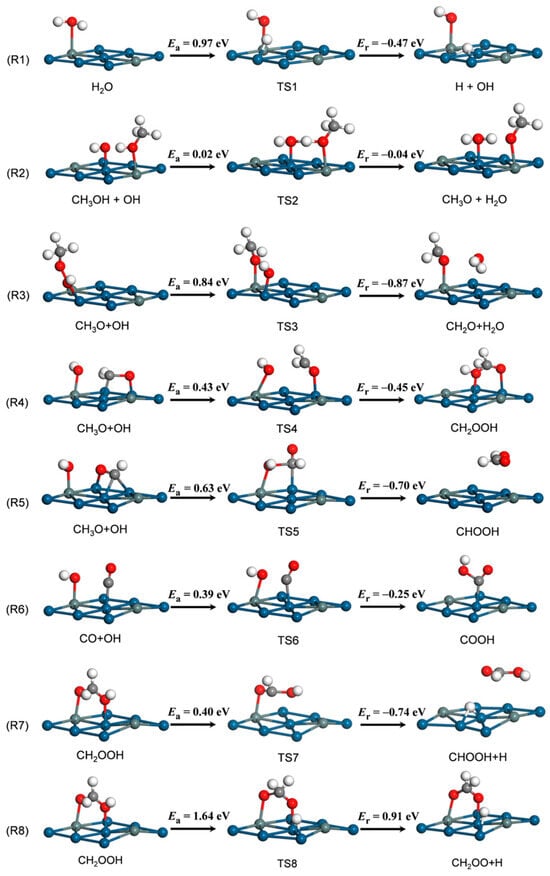 The decomposition reactions of CH3OH, CH2OH, CH3O, CH2O and CHO via O−H, C−H and C−O bond scissions were calculated in our previous study [43]. We found that CH3OH decomposition began with O−H bond scission, followed by C−H bond cleavages, that is, CH3OH → CH3O → CH2O → CHO → CO. To identify the optimal MSR pathway, multiple reactions were further investigated in this work, including H2O dissociation into OH and H and subsequent OH-involving reactions with CH3OH and its dehydrogenated intermediates. The configurations of the involved IS, TS and FS are presented in Figure 3 and Figure 4. Sixteen reactions (R1–R16) were considered in total with their thermodynamic and kinetic parameters.