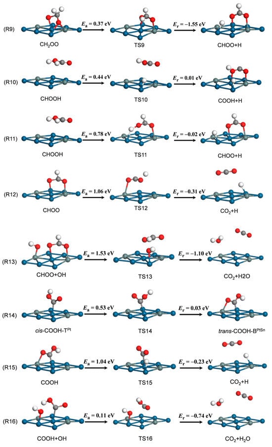 CHxO + OH (x = 0–3). In reaction R3 of CH3O with OH, the energy barrier is 0.84 eV with a reaction energy of −0.87 eV. In TS3, the distance of the breaking O−H bond is 1.27 Å. In reaction R4, the CH2O fragment is weakly bound at the F2PtSn, while the OH fragment stays at TPt site, yielding CH2OOH at the B2Pt site. In TS4, two fragments move to the TPt site, and the distance of the cleaved O−H bond is 2.09 Å. This step is exothermic by 0.45 eV and has an activation barrier of 0.43 eV, lower than that of 0.75 eV for CH2O → CHO [25]. A similar process also occurs on Cu(111) [25] and PdZn(111) [26] For reaction R5, co-adsorbed CHO at the H3Pt site and OH at the TSn site are taken as the IS, and the HCOOH at the H3Pt site is the FS. The distance between C and O atoms is shortened from 3.67 Å in the IS to 1.92 Å in TS5 and to 1.36 Å in the FS. This reaction has an activation barrier of 0.63 eV with an exothermicity of 0.70 eV. For reaction R6, the IS is the co-adsorption of OH at the TSn site and CO at the TPt site, and the FS is COOH at the TPt site. In TS6, the distance of the forming C−O bond is 1.91 Å. This step is exothermic by 0.25 eV, with an activation barrier of 0.39 eV.