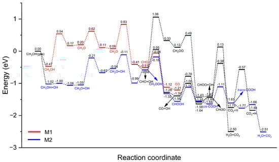 Potential energy surface (PES) of MSR on Pt3Sn(111). The detailed reaction pathways of the M1 and M2 mechanisms are shown in red and blue colors, respectively. Data on the direct decomposition of methanol (CH3OH → CH3O → CH2O → CHO → CO) were taken from our precious work [43].