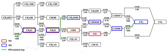 Figure 6 summarizes the MSR reaction network based on the direct decomposition of methanol in our previous work [43] and the results calculated in this study. The most favorable pathway follows the M2 mechanism, in which important intermediates were identified as follows: