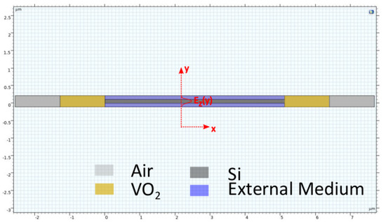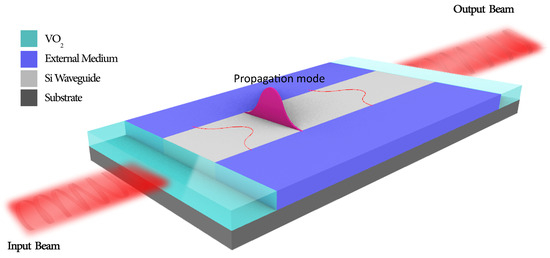 Due to advances in the SOI platform and its compatibility with complementary metal-oxide-semiconductor (CMOS) technology, the wavelength-scale optical elements are achieved [17,18]. A high refractive index contrast in SOI-based structures makes it possible to reduce the overall footprint of the sensor to just a few microns [19,20] by actively confining optical modes. Similarly, there is an increasing use of phase change materials (PCMs) in the integrated optical devices [21,22]. In addition to their relevance with CMOS fabrication techniques, they are also capable of broadband operations [23,24]. Compared to the other kinds of PCMs, vanadium dioxide (VO2) has successfully attracted the attention of many researchers. This is due to its ability to transition from an insulator monoclinic state to a metallic tetragonal rutile state at close to room temperature (68 °C) [25,26,27]. For VO2, this reversible insulator-to-metal phase transition is reached by applying the external agents that can be thermal, electrical and optical in nature [28,29,30]. Both of these two VO2 states greatly differ from each other in terms of electrical resistivity along with optical constants. From our previous work we know that at an operating wavelength of 1550 nm, the refractive index (RI) of VO2 showed a shift from 3.21 + 0.17i in the insulating phase to 2.15 + 2.79i while in the metallic phase [31].